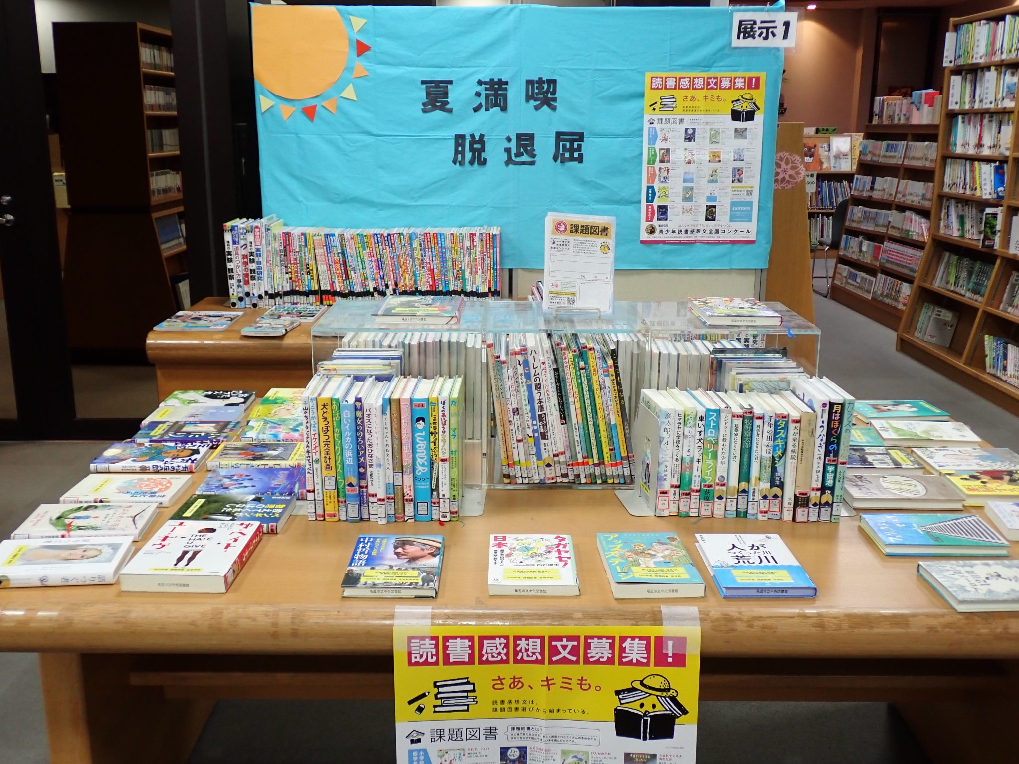 今月は課題図書に選ばれた本や自由研究に役立つ本などを集めました。